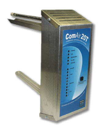 Providing germicidal and odor protection through the centralized HVAC system, the ComAir 20T is designed with two special ultraviolet lamps. The electronic ballast and control system on the ComAir 20T Air Treatment System are microprocessor based for flawless and silent operation. Designed for a very long service life, the ComAir 20T automatically turns on and off via a built-in air flow sensor with little maintenance requirements. A sophisticated control board maximizes lamp life and UV output providing up to three (3) years of continuous lamp use.