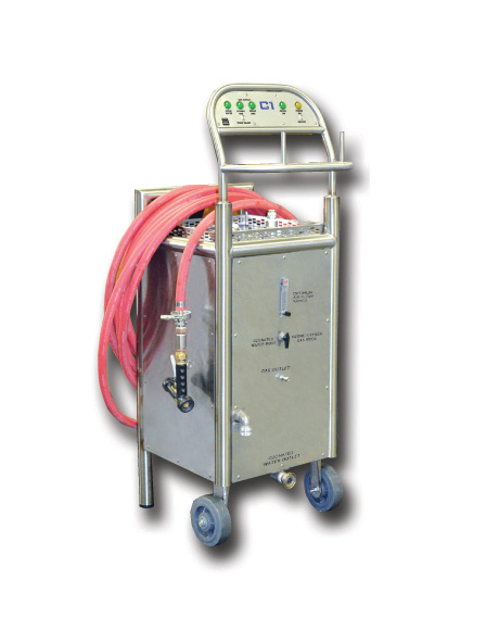 Designed specifically for clean-in-place and surface sanitation, the C-Series mobile disinfection cart uses ozone-enriched cold water supplied at the rate and concentration you desire. Wash down floors, walls, process equipment, rinse barrels, tanks, and any surfaces with the push of a button. The C-Series mobile disinfection cart comes standard with a separately controlled ozone gassing feature. This supply of ozone gas offers you greater disinfection options and is typically used to gas and preserve stored barrels instead of Sulfur Dioxide. In addition to ozonated water, ozone gas will help disinfect sealed containers or tanks, and work as a part of your environmental disinfection protocol. Further, the mobile cart comes standard with a separately controlled oxygen gas feature useful in micro-oxy applications.
